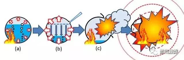 所以在很多液化气爆燃的现场,会接着出现第二次爆炸,其实是第一次爆燃后着火,高温和火焰让其他钢瓶的温度升高,导致出现沸腾液体膨胀蒸气爆炸(BLEVE)现象。火灾现场看到的液化气爆炸,大多都是这种物理爆炸。